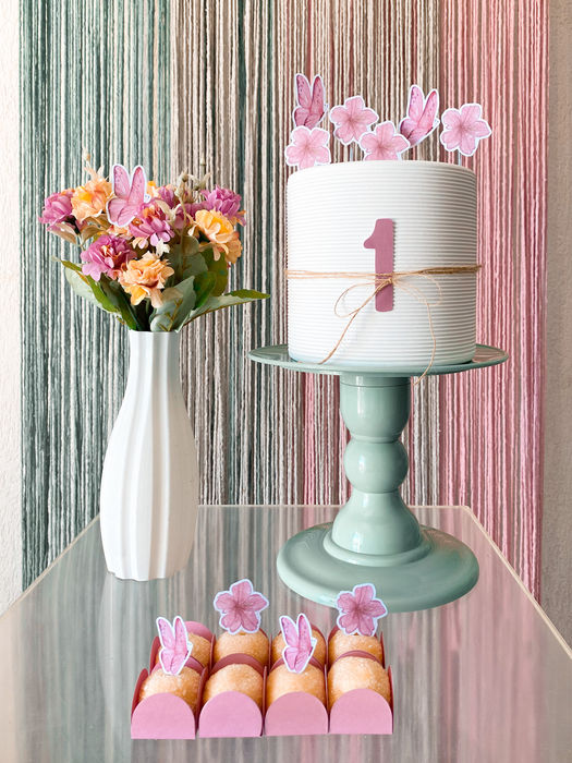 Decoração delicada em tons suaves de rosa candy, verde água e cinza, com detalhes boho. Ideal para aniversários, chás de bebê, chás revelação e celebrações adultas que buscam um toque romântico e contemporâneo.